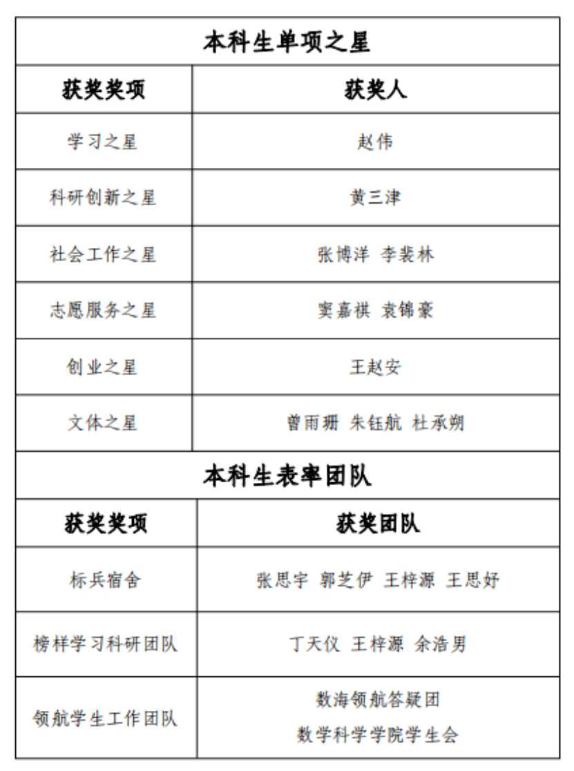 11月16日,2022年“数学之星”评选正式启动。经“数学之星”评审委员会函评与学院内公示, 赵伟、黄三津、窦嘉祺、王浩天、姜亦申、刘泽蕙等15人获评单项之星,数海领航答疑团等6支团队获评表率团队,许多、李泽彤、岳泽阳、陈永鑫、于晟伟、穆欢等29人获评优秀奖,澳门十大信誉好的网站学生会等6支团队获评优秀团队。