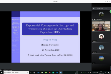 11月27日上午,国家杰出基金获得者、长江特聘教授王凤雨教授受邀为澳门十大信誉好的网站师生带来了一场题为:“Exponential Convergence in Entropy and Wasserstein Distance for Distribution Dependent SDEs ”的学术报告。本报告介绍了分布相关随机微分方程熵和Wasserstein距离的指数收敛性。