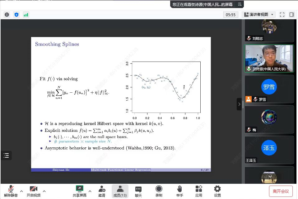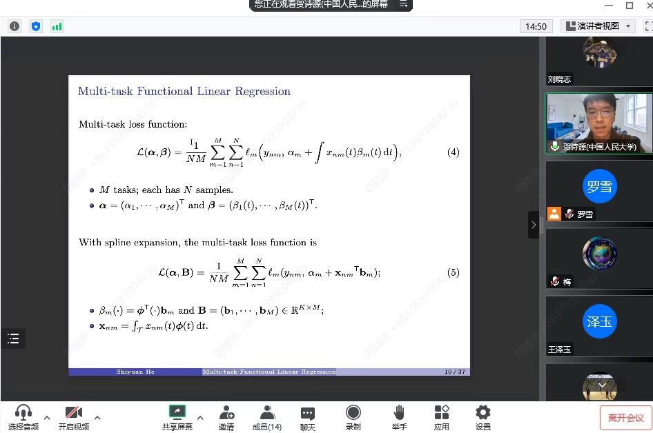 2022年11月18日,中国人民大学统计与大数据研究院贺诗源老师应罗雪老师的邀请,通过线上的方式为澳门十大信誉好的网站师生带来了一场题为“A Unified Analysis of Multi-task Functional Linear Regression Models with Manifold Constraint and Composite Quadratic Penalty”的学术报告。