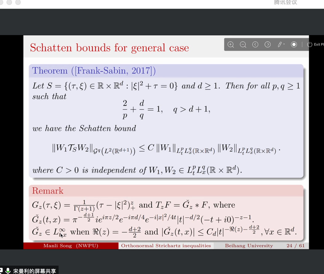 报告主要介绍了和广义的Laguerre和Dunkl算子相关的Strichartz不等式,这些不等式是对一族正交系统给出的。报告人首先回顾了近期关于正交系统上的限制性,Strichartz估计研究的一些历史和已经取得的经典结果,特别是Frank-Sabin等人的工作。介绍了Laguerre 算子,Dunkl算子引入的背景以及满足的性质。最终将Frank-Sabin的方法推广到更一般的微分算子上去,得到了广义的限制性和Strichartz估计,最后报告人还提出了一些有趣的问题。参会老师就报告内容行了热烈讨论交流。