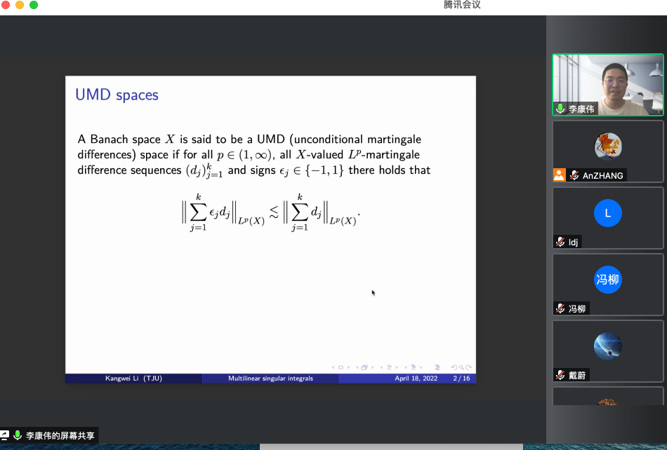2022年04月18日,天津大学李康伟教授,应邀为澳门十大信誉好的网站师生做了题为 “UMD-valued extension of multilinear singular integrals”的学术报告,报告由张安老师主持。
