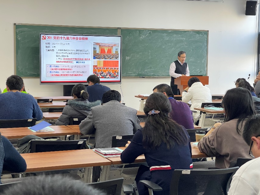 为深入学习贯彻党的十九届六中全会精神,2021年12月29日,澳门十大信誉好的网站在沙河校区E404召开全体教职工大会,全院80余名教职工参加会议,韩德仁院长做党的十九届六中全会精神宣讲,会议由党委书记袁星主持。