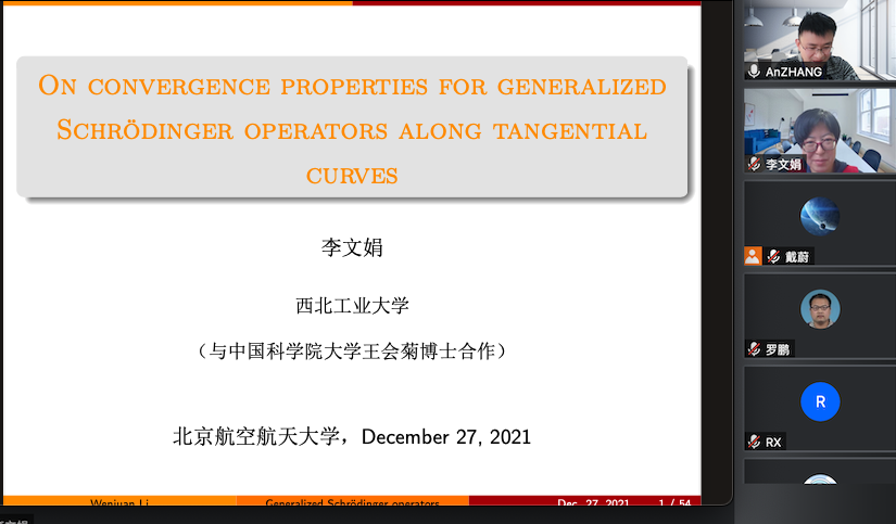 2021年12月27日下午,西北工业大学李文娟教授,应邀为澳门十大信誉好的网站师生做了题为 “Convergence properties for generalized Schrödinger operators along tangential curves”的学术报告,报告由张安老师主持。