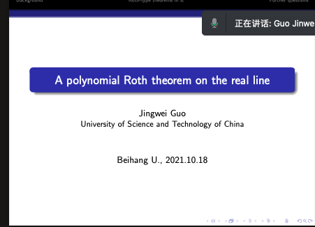 2021年10月18日下午,中国科学技术大学郭经纬教授,应邀为澳门十大信誉好的网站师生做了题为 “A polynomial Roth theorem on the real line”的学术报告,报告由张安老师主持。