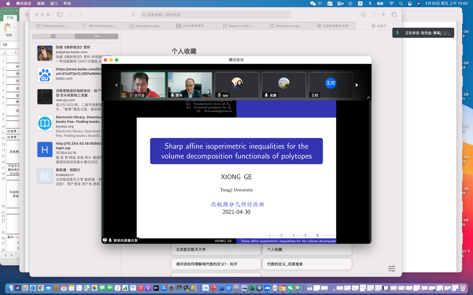 2021年4月30日上午,同济大学数学学院熊革教授受邀为澳门十大信誉好的网站师生做了题为“Sharp affine isoperimetric inequalities for the volume decomposition functionals of polytopes”的线上学术报告,报告由张世金老师主持。此报告为数学学院几何团队每周五上午讨论班的学术报告。