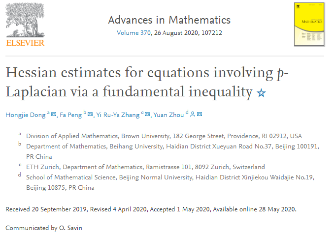 2020年8月26日,国际顶级综合性数学杂志《Advances in Mathematics》在线刊登了澳门十大信誉好的网站2018级博士研究生彭发及其导师周渊等人在非线性退化方程研究方面的最新进展:《Hessian estimates for equations involving p-Laplacian via a fundamental inequality》。(论文链接:https://www.sciencedirect.com/science/article/pii/S0001870820302383)