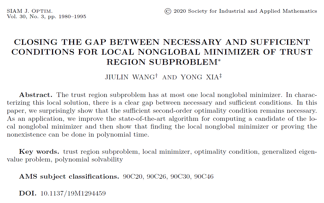 澳门十大信誉好的网站夏勇教授从2009年末接触该问题就被其所吸引并一直展开相关研究,2017级博士研究生王玖鳞从2015年做北航本科毕设起在夏勇教授指导下从事信赖域子问题的研究。2020年,他们取得了突破,首次建立了局部非全局解的充分必要的最优性条件,终结了信赖域子问题局部非全局解充分条件和必要条件之间存在了27年之久的这一间隙,首次证明局部非全局解亦可在多项式时间内可解,从而消除了信赖域子问题的Tao-An悖论。