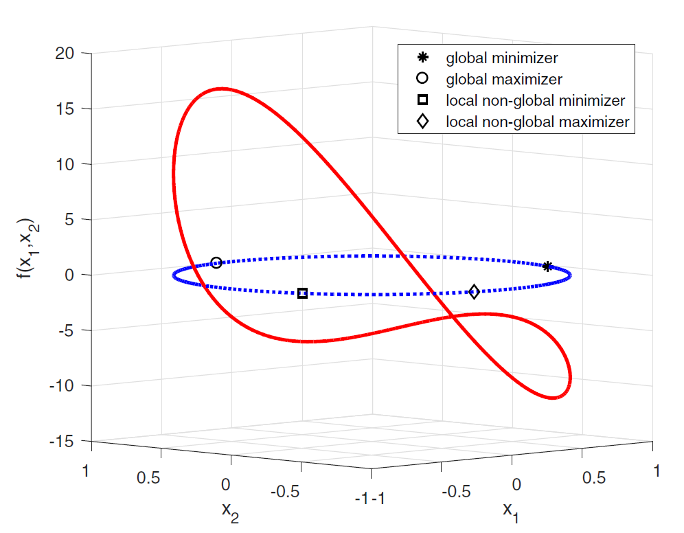 图1:二维空间信赖域子问题全局解和局部解示例