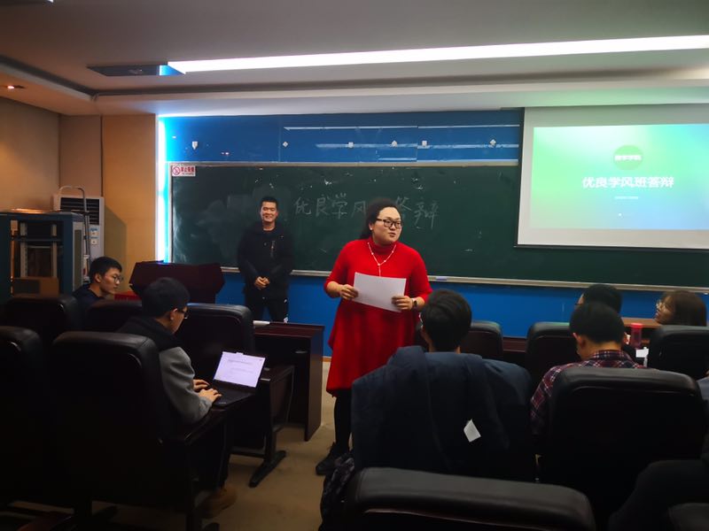 2018119日,数学与系统科学学院本科生在主楼321教室进行了2018年优良学风班答辩,出席本次答辩会的有学院2016级各小班答辩代表和部分学生,学院党委副书记丁丁老师、班主任代表郑孝信老师、教务秘书曹安妮老师、2015级辅导员张孝涛和2016级辅导员刘禹吟担任评委。本次答辩会由1609大班宣传委员刘晋玮同学主持。