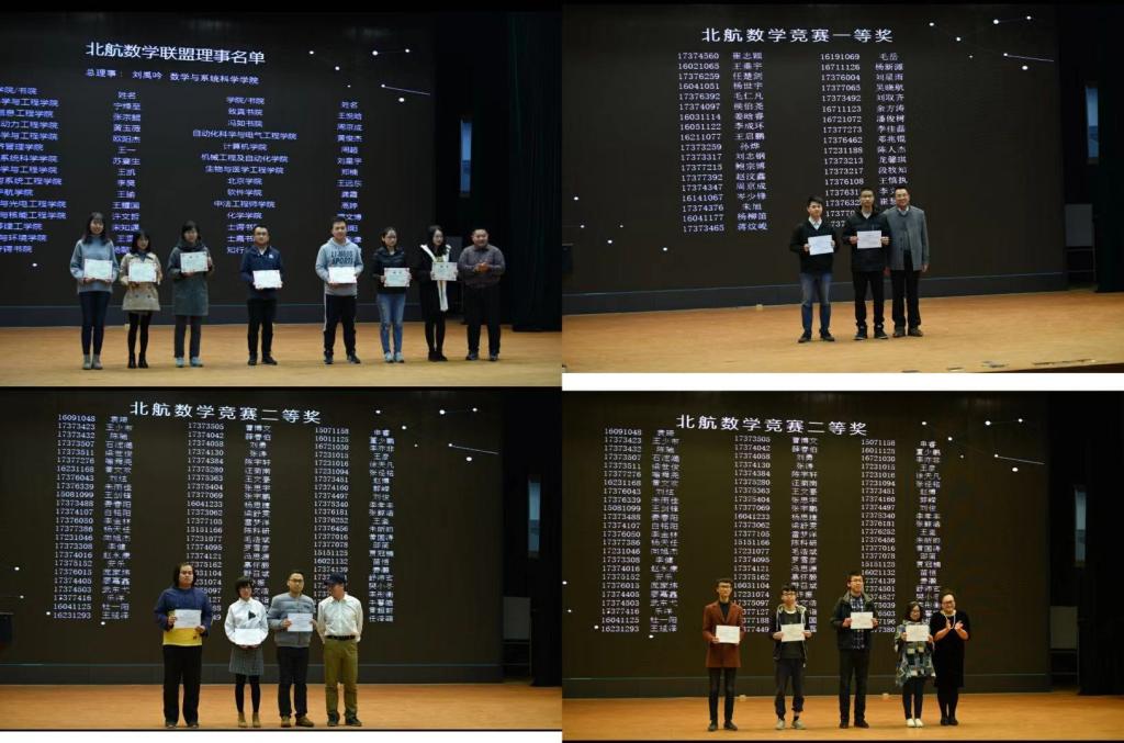 开幕式伊始,出席开幕式的老师们分别为第三届北航数学竞赛联盟的学生理事以及2018年北航数学竞赛的一、二、三等奖获奖学生代表颁发了聘书和获奖证书。