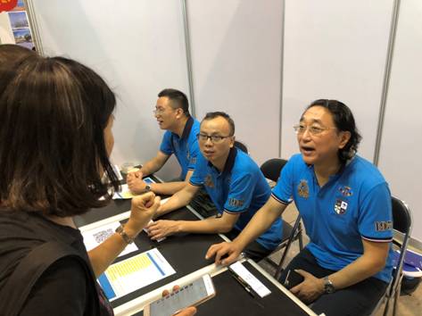 | 袁星书记(左一)和广州校友会秘书长张滨滨(右一)、校友谢经干(右二)在广州市琶洲高招会现场为家长解答疑惑 |