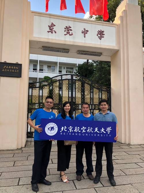 | 校友谭汉齐(左一)、何丽冬(左二)、马骋(右二)、黄伟华(右一)独立完成了北航在东莞中学的招生宣传工作 |