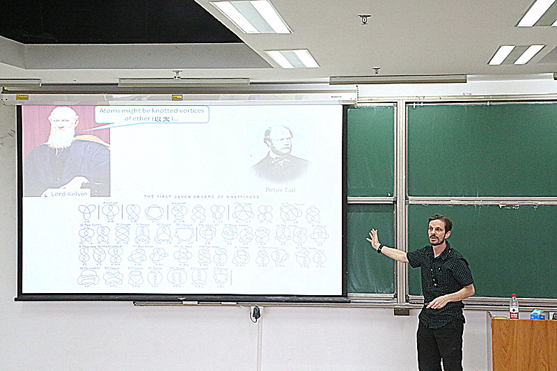 Eric Rowell教授首先以一些精美的纽结图案引入他的主题,从拓扑学的角度为大家介绍了纽结理论,该理论主要应用于封闭曲线的研究。然后Eric Rowell教授介绍了该理论的发展历程,纽结理论最早的灵感来源于开尔文对于不同化学元素的结构理论,虽然这个理论早在1865年就被提出,但是当时科学家们放弃了它,没有进行深入的研究,而如今,150年后,科学家们才认识到这个理论在物理学量子信息领域的重要性。最后,Eric Rowell教授就该理论在量子信息领域的作用进行了介绍。讲座虽然只有短短的90分钟时间,但同学们都受益匪浅。