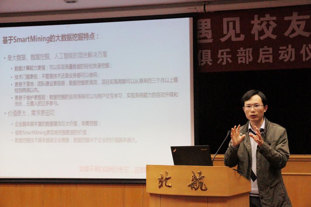 3月23日下午,由北航数学与系统科学学院举办的“走近数据时代——当学生俱乐部遇见校友企业”分享会,在北航学院路校区如心中报告厅举行。会议由学院党委副书记王菲老师主持。出席此次活动的嘉宾和领导分别有:广州思迈特软件有限公司副总裁徐晶校友,广州思迈特软件有限公司数据挖掘事业部总经理汪尚先生,项目总监吴向阳先生,北航数学学院党委书记李红捷,数学学院刘超、冯伟、王海辉等老师,研究生辅导员林泽田,以及广大学子们。