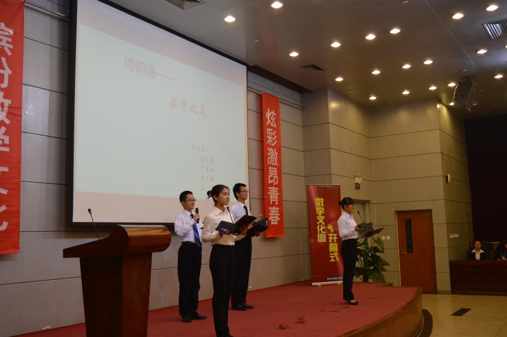 开幕式在精心制作的宣传视频中拉开帷幕。首先,数学学院学生会主席方泽华同学介绍了北航数学文化周的发展历史和活动安排,盛情邀请校内外的同学们参与文化周的活动。接下来,数学学院2015级的同学们带来了诗朗诵《数学之美》和歌曲串烧,激昂的朗诵和轻松的歌曲展现了数学学院学生们的蓬勃朝气和对数学的热爱。