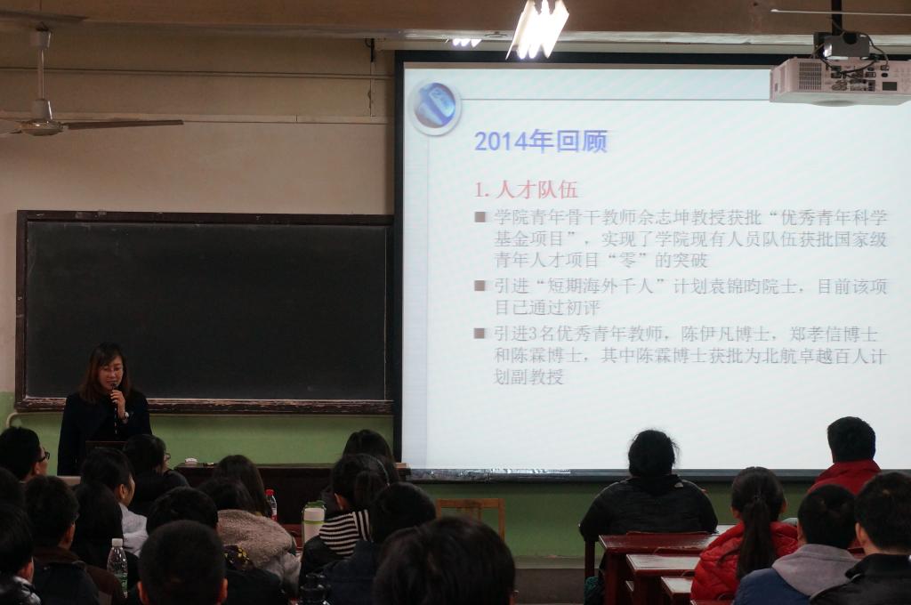王菲副书记首先对2014年学院发展情况及学生工作情况进行了通报,并对2015年学院工作进行展望,希望同学们了解学院的发展情况。随后,李红捷书记由“2015年每位党员的目标与计划”展开讲话,深刻地阐述了党员的特质,并希望全体党员能在以后的学习生活中力争上游,争做优秀的人。研究生辅导员陈平分享了自己两年半的学习工作心得,并激励党员们了解自己的兴趣并将其变为擅长,待机会来临时实现自我。新任研究生辅导员李田田作了履新发言,表示会尽心尽力为全体研究生同学服务。辅导员李垠序对过去一年校友工作组的工作进行了总结并作出新一年的工作畅想,希望全体研究生同学支持与配合。