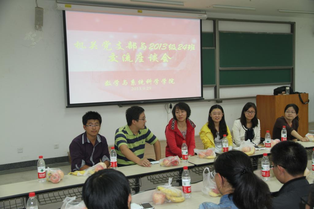 9月29日下午,数学与系统科学学院机关党支部与2013级24班新生交流座谈会在沙河校区教三210教室举行。数学与系统科学学院机关党支部成员、2013级24班学生、班主任牟晨琪、辅导员杨亮参加座谈会。座谈会由机关党支部书记秦安安主持。