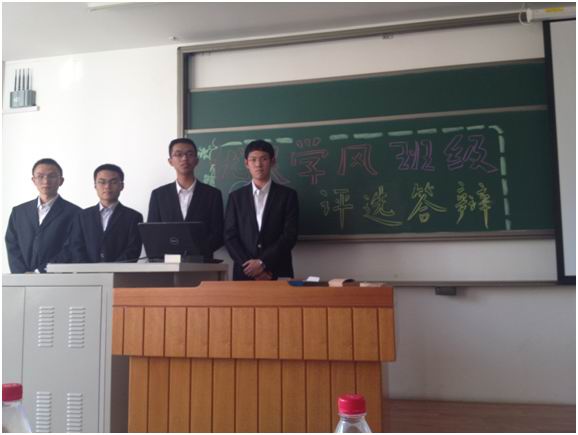 先上场的是110921班,他们首先向评委们分发了答辩提纲的宣传单,并以新颖的展示方式使人眼前一亮。他们将展示分为优秀个人成绩和班级整体两部分,并以轻松诙谐的展示方式赢得了全场的掌声。接下来的110922班秉持一贯的严谨风格展示并分析了本班的学习成果。110923班以班级学风建设为主题详细展示了本班的班级建设和科技活动等方面,其答辩同学大方成熟的答辩风格令人印象深刻。随后110924班以精美绝伦的PPT和充分的完成了答辩。最后进行答辩的是110941班,他们以简洁明快的幻灯片为基础,充分诠释了华罗庚班的“仰望星空,脚踏实地”的精神,并表达了将这种精神转化为华罗庚班在学习与科技创新之路上永续前进的基石的远大理想和目标。根据评委们综合评估的结果,110924与110941班被评为了学院优良学风班。