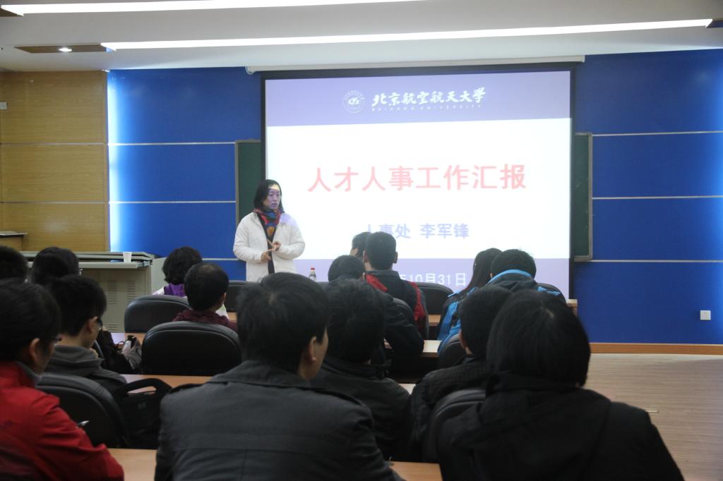 李军锋处长讲到,围绕学校建设空天信融合特色世界一流大学的战略目标,我校人才工作遵循“崇尚知识、崇拜人才”的理念,以服务国家战略需求、瞄准国际学术前沿为基点,努力打造高端人才不断汇聚、师资队伍持续发展、用人机制灵活多样、成长环境宽松和谐的人才工作新局面。李处长强调,国家已出台首个《国家中长期人才发展规划纲要》,国家层面的人才支持政策已由传统的单一体系发展为多渠道的人才支持体系。学校层面的人才成长支持体系和团队发展支持体系也在不断的完善发展。在新的人才支持体系下,教师队伍的建设面临着机遇与挑战。就学校近期发布的蓝天人才行动计划(二期),李处长从行动计划的内涵、内容、保障措施等三方面进行了详细介绍。针对学院教师所关心的人才发展激励机制、择优选留机制以及出国研修、职称、进人、绩效等政策,李处长做了认真细致的说明,并对学院教师的职称晋升等情况做了统计分析。