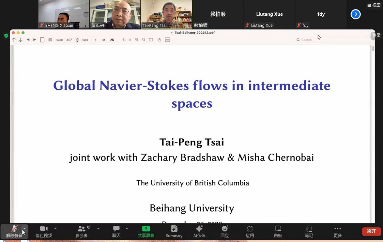 蔡教授的报告内容前沿新颖、逻辑清晰,深入浅出,在线师生听后深受启发,受益匪浅。报告结束后,蔡岱朋教授与参会师生就Navier-Stokes方程自相似解相关问题展开了热烈的讨论与交流。