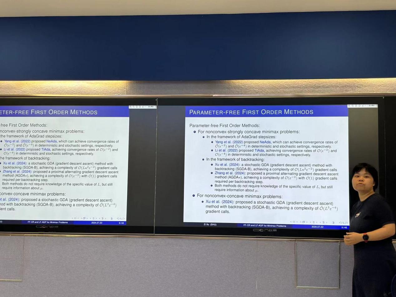 上海大学徐姿教授的报告题目为《Parameter-free Optimization Algorithms and Iteration Complexity for Minimax Optimization Problems》。对于大多数解决极大极小问题的现有算法,要实现算法的最优复杂度,需要假设问题的某些参数的精确信息,如Lipschitz常数、从初始点到最优解的距离的上界等。准确估计这些参数通常是具有挑战性的,保守的估计会显著影响算法的性能。徐姿教授报告了一种无参数交替梯度投影算法及其在非凸强凹设置下的收敛速率,该算法结合了回退策略,用于解决光滑的非凸()凹极小极大问题。此外,徐姿教授报告了一种完全无参数三次正则化算法及其迭代复杂度,该算法不需要问题的任何参数,包括Lipschitz常数和从初始点到最优解的距离上界。