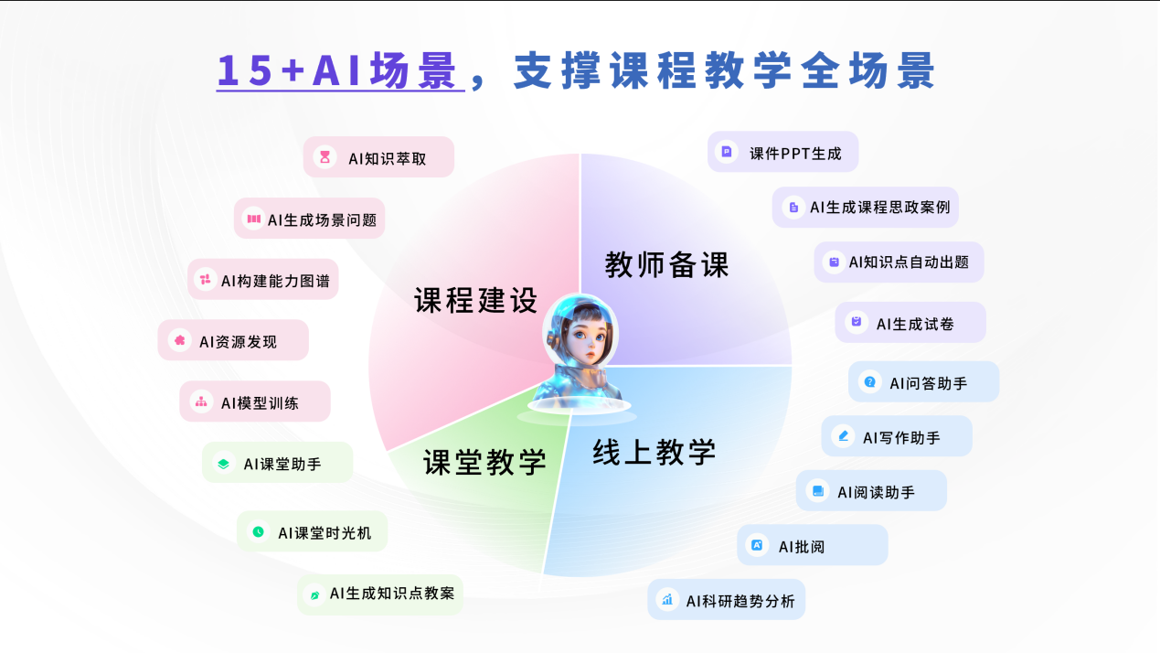 3.AI赋能15个校内教学应用场景,支撑课程教学的课前、课中、课后全流程