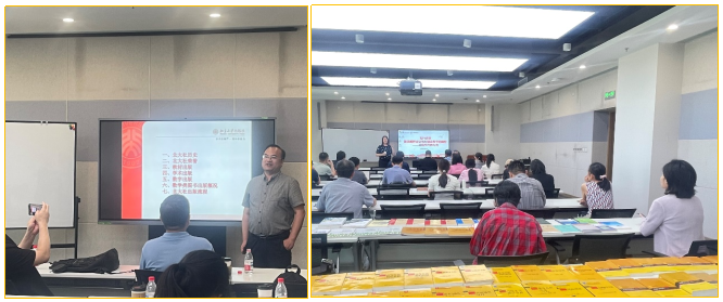 讲座还特别邀请到北京大学出版社理科一编辑室刘啸主任及潘丽娜、尹照原、舒言等编辑参加交流研讨。刘啸主任分北大社历史、北大社荣誉、教材出版、学术出版、数字出版、数学类图书出版概况、北大社出版流程等七个方面为在场教师们介绍了北大出版社在数学类教材出版方面的曲康和设想。在随后的互动环节,出版社展示了最新出版的优质数学教材与学术专著,并开展了现场赠书活动,为教师教学科研提供了丰富的参考资料。