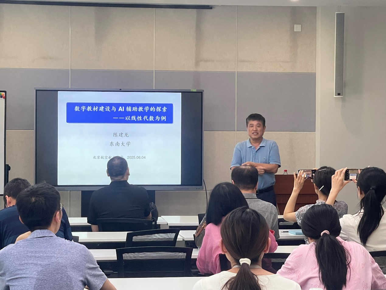 报告中,陈建龙教授以东南大学荣获首届全国教材建设奖的《线性代数》教材为例,系统介绍了教材从传统纸质版到数字化的创新发展历程。在人工智能技术快速发展的背景下,陈教授深入分析了AI技术对高等数学教育带来的机遇与挑战,重点分享了数字教材建设经验及AI辅助教学的前沿探索。报告内容翔实,既有理论高度,又包含丰富的实践案例,为在座教师提供了宝贵的教学改革思路。