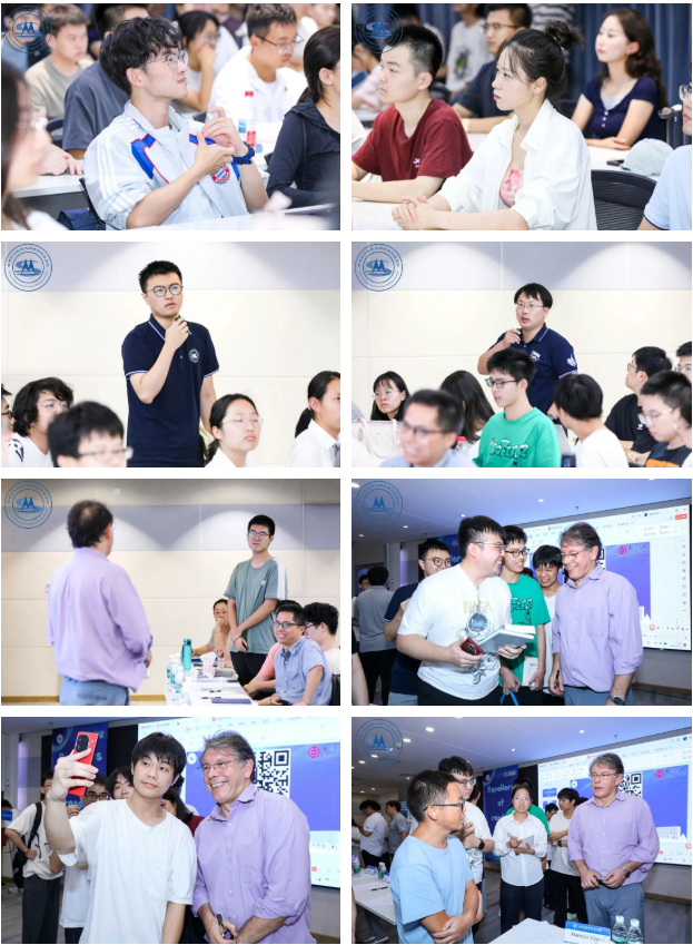 讲座现场气氛热烈,师生们积极互动。讲座开始前,全体师生与Viana院士合影留念,留下了宝贵的记忆。讲座结束后,许多同学踊跃提问,与Viana院士深入探讨数学研究中的问题与想法。Viana院士耐心解答,并寄语同学们保持好奇心与独立思考,勇敢面对挑战,不畏失败,敢于提出新问题、探索新方向,在研究中保留探索的野心,成就自己的学术梦想。