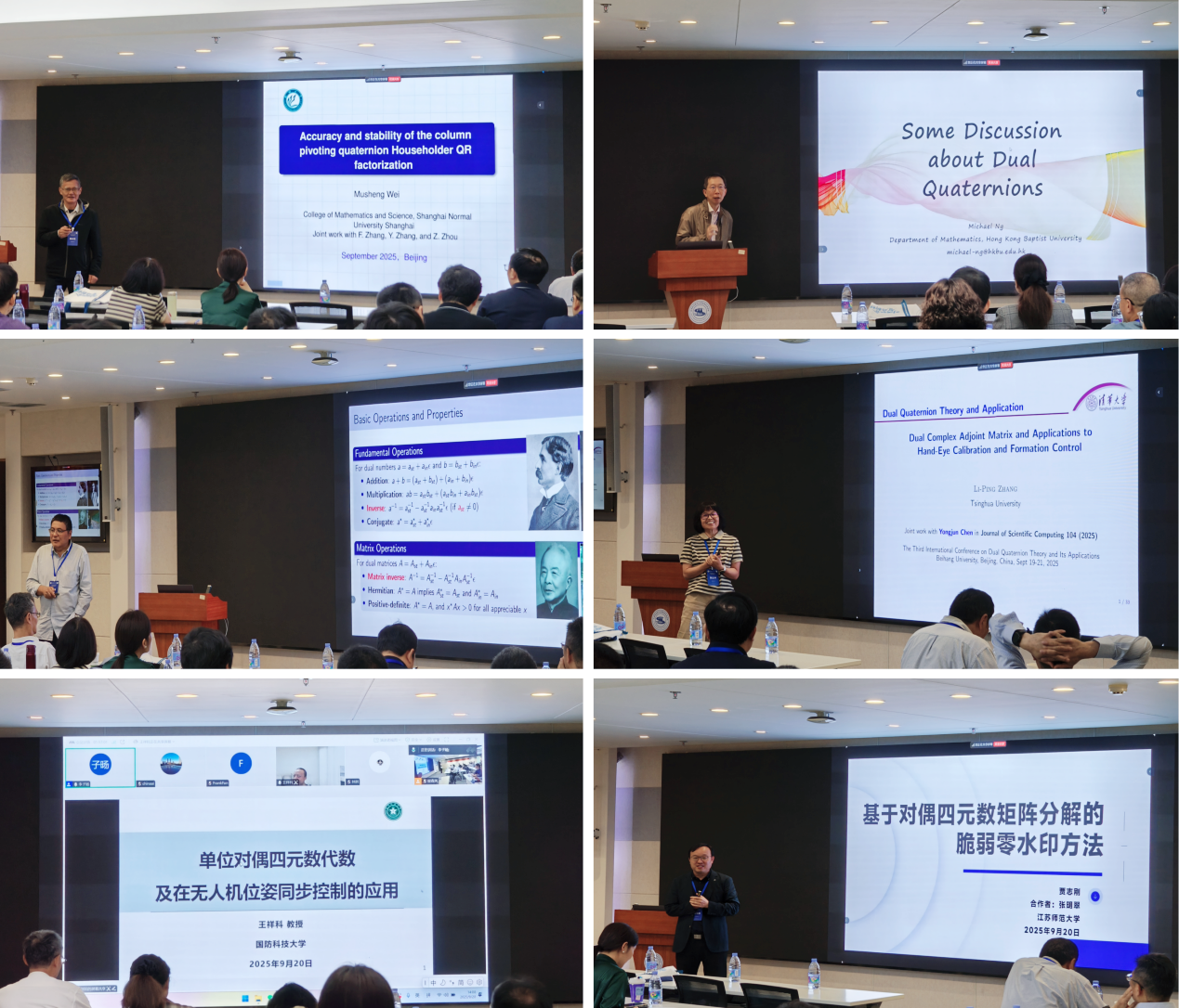 大会共有15名专家学者、5名博士及硕士研究生作了精彩的报告。报告围绕对偶四元数的理论创新与工程应用展开深入探讨,重点展示了对偶四元数矩阵的相关数值代数理论以及在无人机编队控制、手眼标定、卫星轨道等实际工程方面的应用,为我们展示了相关领域的重大进展。