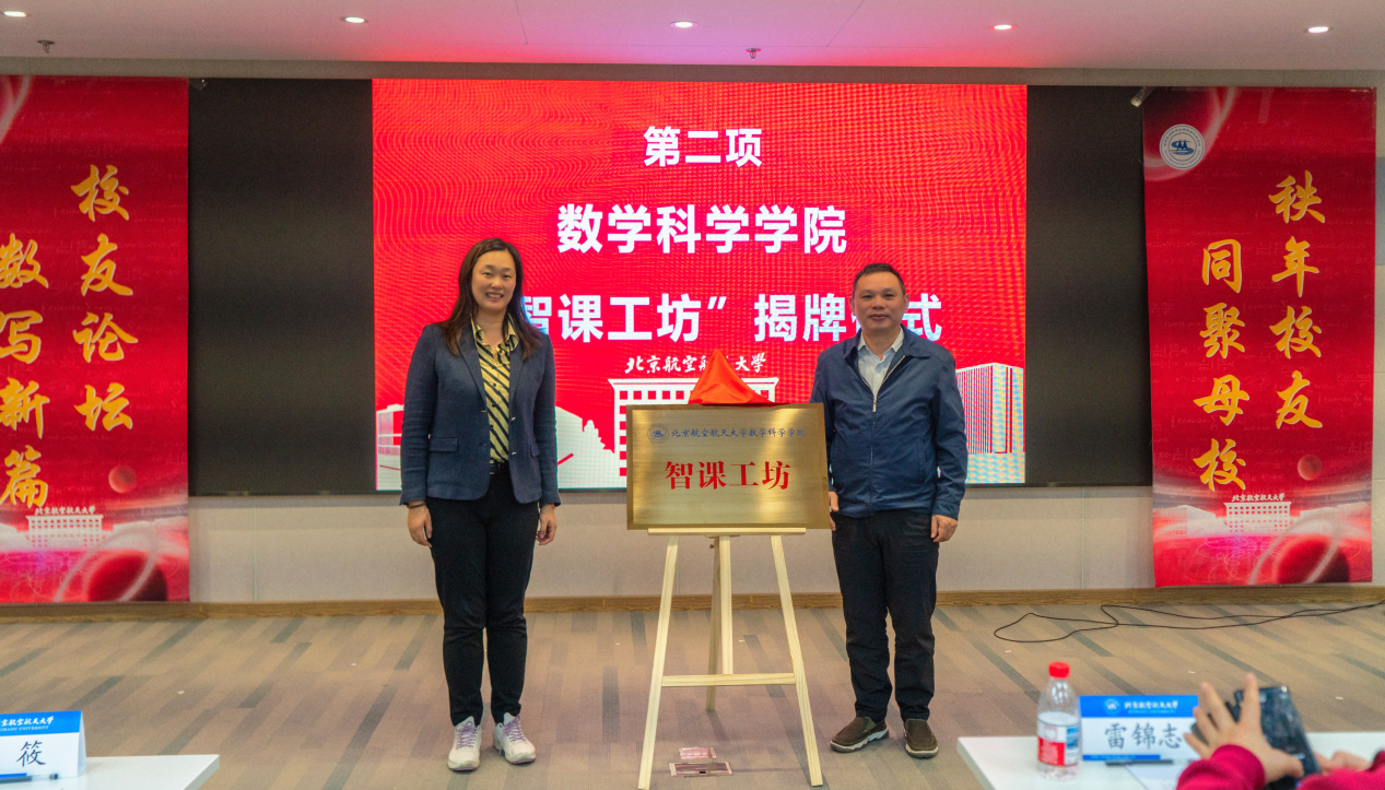 论坛现场,1991级本科校友张秋与张筱书记与共同为澳门十大信誉好的网站“智课工坊”揭牌。深圳锐取信息技术股份有限公司董事长张秋校友向学院捐赠11套数字化教学设备,学院特别成立“智课工坊”,将以捐赠设备做好数字化教学支撑,为数学拔尖人才培养全国首批虚拟教研室的建设积累数字素材,把北航数学教研模式推向全国。